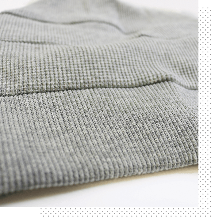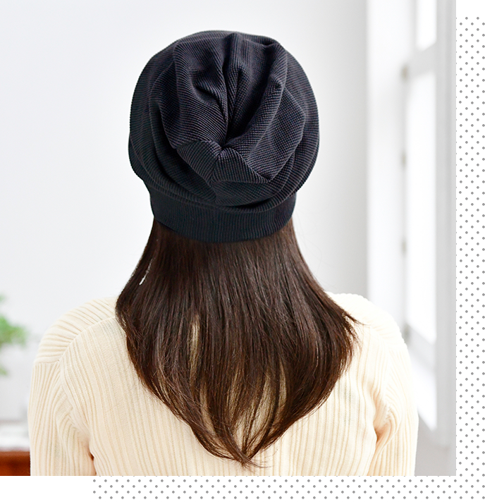伸縮性に優れたやわらかいワッフル素材は肌ざわりが良く、一日中被っていてもストレスがありません。