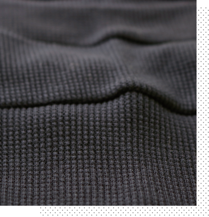 やや厚みがあるニット生地で、夏は肌にまとわりつかず、冬は空気を含み暖かいのが特徴。